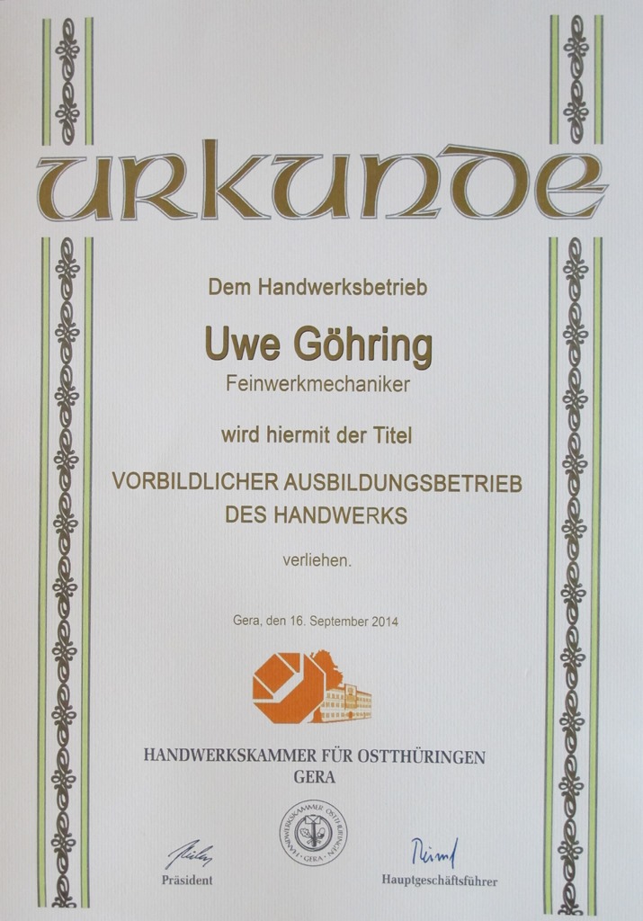 Wir zielen nicht nur darauf ab, unseren Lehrlingen eine bestmögliche Ausbildung zu bieten, sondern auch darauf, qualifizierte und loyale Fachkräfte für unseren Betrieb zu gewinnen. Seit 1931 arbeiten wir beständig an uns und unserem Ausbildungskonzept, welches bereits zu vielen Erfolgen führte: Zum Beispiel durch die Handwerkskammer verliehenen Prädikat "Vorbildlicher Ausbildungsbetrieb" und schon mehrfach zum besten Abschluss unserer Lehrlinge im Bereich Ostthüringens.